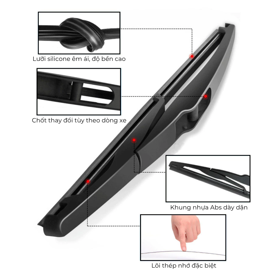 Gạt mưa sau dành cho Ô Tô được thiết kế với khung nhựa ABS dày dặn và lưỡi Silicone chất lượng cao, đem lại hiệu năng gạt hiệu quả trong nhiều điều kiện thời tiết và độ bền tốt.