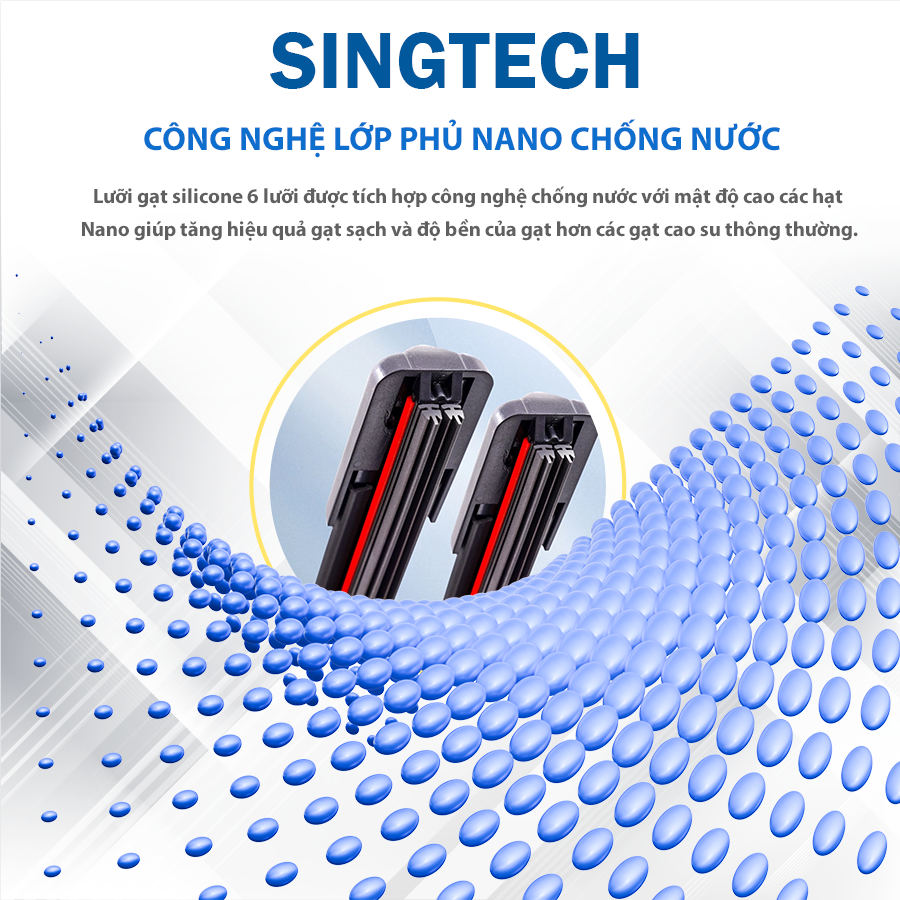 Đặc biệt, công nghệ sản xuất lưỡi gạt silicone tiên tiến nhất hiện tại, 100% lưỡi gạt Singtech 6 lưỡi trải qua quá trình ép nhiệt với mật độ silicone cao với cao su thông thường, điều này đảm bảo được độ bền của lưỡi gạt hoạt động ở hiệu suất cao trong điều kiện thời tiết khắc nghiệt. Đồng thời, lưỡi gạt silicone được phủ lớp Nano Graphite giúp tạo 1 lớp chống nước ở trên bề mặt kính, khi sử dụng gạt khiến nước khó bám vào bề mặt, đồng thời tạo điều kiện cho tầm nhìn tài xế rõ ràng hơn.